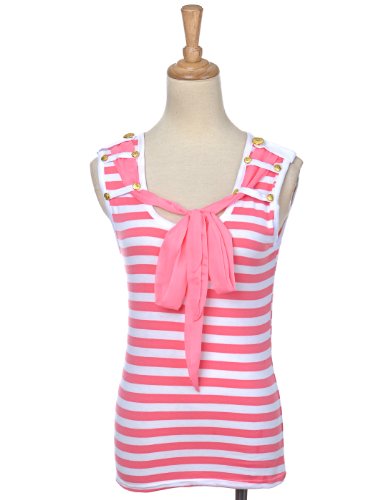 A pretty in pink casual tank top that's designed in a stripe pattern. It's a sleeveless piece that's form fitting to outline your curves. Shiny gold metal buttons decorate the shoulders. The shirt is also decorated with a pink ribbon that ties in a bow tie in the front. Perfect to wear during the summer time. DETAILS: - SMALL/MEDIUM FIT - BUST:32" - WAIST:28" - BODY LENGTH:24" - COLOR: The same color with pictures - Material: Polyester Cotton