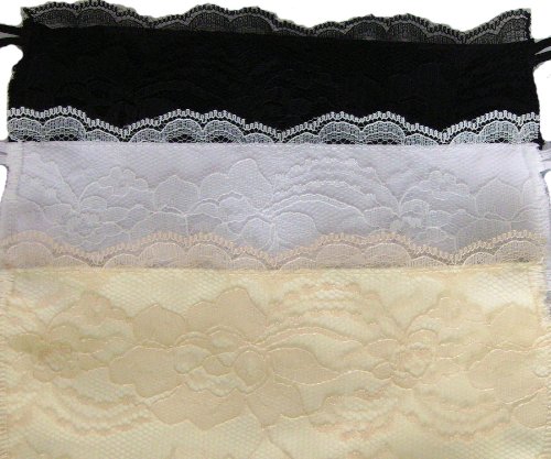 Women fall in love with the silky, soft feel of this peach skin fabric and how easy it is to care for. It can go dressy or casual and blends well with most fabrics. Peach skin is a smooth finish applied to finely woven Micro Fiber fabric...allows garments to flow with your movements and drape beautifully...is not too heavy nor too hot...soft, smooth & moderately wrinkle-resistant. (womensuits.com) Set of 3 colors: black, ivory, and white. Lace does not touch skin to prevent itching. Sizes: s, m, l, xl, xxl. Our sizes do not correspond to ladies tops sizes small through xxl. For best fit and function, see the Directions section or our size chart photo to determine your size. Women find that following our size chart & fit tips results in a great fit & functioning as promised. This patent-pending design uses elastic loops & buttons. Wrap the elastic loop around the bra strap & then around the button. The package inside provides tips for adjustment to get a perfect individual fit. The tension created keeps it at the height you choose. Flat and smooth buttons that you won't even feel. Chemisettes by Anne [pronounced shem uh zet] has developed a reputation for a high-quality product and excellent customer service. The pictures on your website do not come close to doing your product justice. The chemisette was gorgeous...! Diane B., Holbrook, MA They solve so many clothing issues for women, making them a must-have for every woman's wardrobe. Cover cleavage, scars, or embarrassing skin conditions. Teachers, caregivers, and businesswomen wear them to stay covered when bending forward to assist a student, patient, or colleague. An affordable way to give a different look to your favorite blouse or sweater. Cooler and less bulky than wearing two layers. Nursing moms appreciate them because camisoles and tank tops make it difficult to nurse their baby. Also available in sets of 6 and 9 for additional savings on purchase price and shipping.