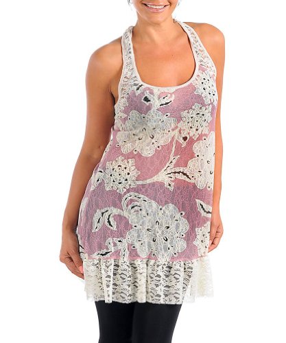 Sheer lace racer back tank has a delicate floral pattern and ruffled hem. Unlined. Material: 94% nylon, 6% spandex. Origin: Made in USA. Cleaning:Hand Wash Fit Guide:Size 1xL measures: 38" bust.
