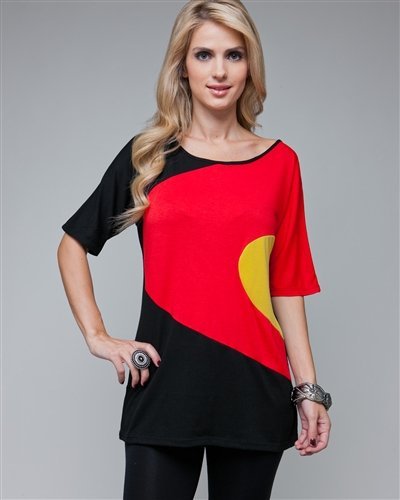 Swirled color block tunic has short sleeves and bold pattern at the front only. Material: 60% polyester, 35% rayon, 5% spandex. Origin: Made in China. Cleaning:Machine Wash. Fit Guide:Size 1x measures: 44" bust.