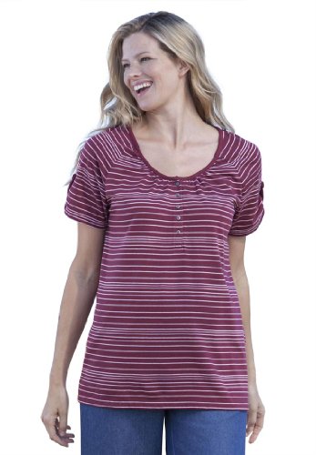 You just might call this the perfect tee. And if the stripes look perfect to you, too, youre right! We designed them that way. Yarn dyed, they match up completely on the sides and even in the sleeves. This is your basic, go-to casual tee, comfortable and pleasing. Youll love the soft knit and flattering varied pattern. Our plus size tee shirt is colorful, current and a constant reminder of how much you get for so much less at Woman Within. Customers love the special design elements of our plus size striped tee. Like the pewter buttons, tabbed sleeves, colors offered, and stripes in this tee shirt. Customer, Simi Valley, CA Henley knit tee has self banded U-neck front shirring for a roomy fit 5 pewter buttons with 2 holes short raglan sleeves with button pewter button tabs for a laid-back look front and back straight hem classic tee length: 28 soft, washable cotton/polyester jersey with yarn dyed stripes that match at side seams and sleeves, imported a great look with something from our plus size jean collection! don't forget to style with a feminine flat in wide widths Womens plus size tee and plus size top in sizes M(14W-16W), L(18W-20W), 1X(22W-24W), 2X(26W-28W), 3X(30W-32W), 4X(34W-36W), 5X(38W-40W)