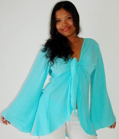 Simple designs are often the best and this is a case in point. This delightful summer-time blouse has a v-neckline, long bell sleeves and a sash tie under the bust for closure. The tie allows you to create an individualized fit that's comfortable and really figure-flattering.This is done up in a slightly textured rayon that's cool and has a wonderful flowing quality. Available in a wide assortment of either soft summer pastels or versatile neutrals.Wear this as a light and airy summer blouse or as a shrug over a cami. And it would look really great worn with one of our tiered peasant skirts (see our store) or wide leg pants (ditto) in the same crinkle textured rayon. You're going to love this.
