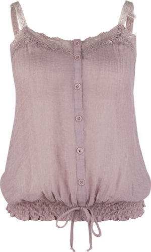 Full Tilt woven tank. Button front with decorative tie at front. Lace trim. Elastic smock panel at bottom hem. Adjustable shoulder straps. 60% rayon/40% polyester. Machine wash. Imported.