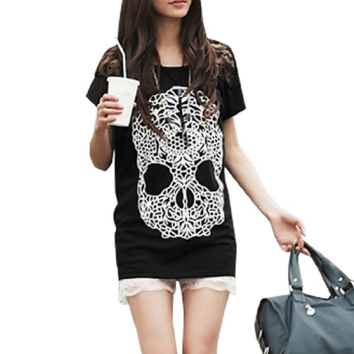 Scoop Neck, Skull Prints Front, Pullover, Skinny, Semi Sheer Lace Patchwork Shoulders. The model in our picture is about 5.2Ft in height. Shirt Only,other accessories photographed not included. Please Kindly check your measurements to make sure the item fits before ordering.