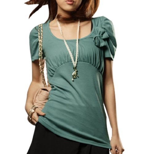 Scoop Neck, Bowtie Decor Puff Shoulder, Short Sleeve, Pullover Design, Stretchy Shirt. The model in our picture is about 5.3Ft tall. Ladies Shirt ONLY, other accessories photographed not included. Please check your measurements to make sure the item fits before ordering.